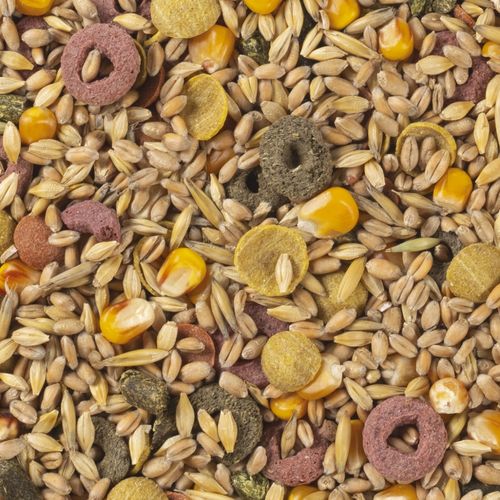Zloženie: Produkty rastlinného pôvodu (vrátane lucerny 12%, trávy 8%, rohovníka 3%), obilniny, semená (hrach 3,3%), ovocie (banán 1,4%, jablko 1%), zelenina (vrátane červenej repy 1,2%).