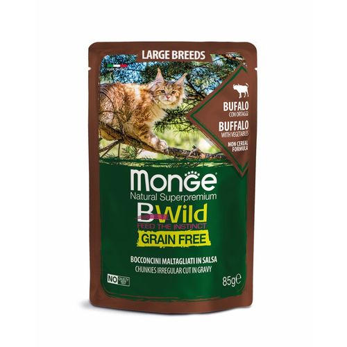 Monge Bwild Cat Grain Free All Life Stages Large Breeds Chunkies in Gravy Buffalo so zeleninou Monge Natural Superprémiové Bwild Grain Free Formula Buffalo so zeleninou (zelená fazuľka a mrkva) je kompletné a vyvážené krmivo pre mačiatka a dospelé mačky veľkých plemien. Špeciálne vyvinuté pre zdravie vášho mačiatka prostredníctvom výberu alternatívnych zdrojov sacharidov neobilného pôvodu, ako sú zelená fazuľka a mrkva. Lososový olej zvyšuje obsah tuku a pomáha normálnemu vývoju nervového systému*. Receptúra je obohatená o xylo-oligosacharidy (XOS), prebiotiká novej generácie, na podporu zdravia čriev. Obsahuje juku schidigera na obmedzenie zápachu stolice.