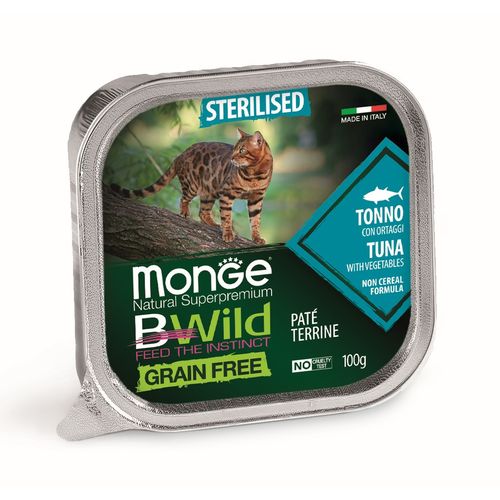 MONGE BWild Cat Grain Free Sterilised 100g bezobilninové krmivo pre sterilizované mačky tuniak so zeleninou vanička