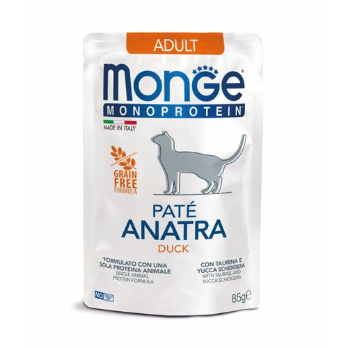 MONGE Monoprotein Pate Adult 85g monoproteínová paštéta v kapsičke s kačicou pre dospelé mačky, je unikátna línia ponuky Monge. Vysoká kvalita výrobkov je zaručená použitím surovín vybraných a testovaných špeciálne pre každú receptúru bez farbív a umelých konzervantov.Každé krmivo bude pre mačky skutočným potešením vďaka použitiu najkvalitnejšieho čerstvého mäsa a prítomnosti zložiek špeciálne vybrané pre ich výživové vlastnosti Chuťové recepty si určite nájdu svojich priaznivcov sofistikovaného podnebia, ktoré vám pomôžu udržať vašu mačku vo forme, plnú energie a chuti na hranie.Zloženie: čerstvé kačacie mäso 46%, kačací vývar, zemiaky 4%, kvasnicové výrobky 2%, minerálne soli, hrachová vláknina 0,5%, juka schidigera 0,025%. Analytické zložky: surové bielkoviny 9,5%, surová vláknina 0,2%, surové tuky 5%, surový popol 2,5%, vlhkosť 79%, metabolická energia 982 kcal/kgVýživové doplnky: vitamín A (retinyl acetát): 7250 IU / kg,vitamín D3 406 IU / kg, vitamín E (all-rac-alfa-tokoferylacetát) 15 mg / kg,selén (selenín sodný 0,09 mg / kg) 0,04 mg / kg, mangán (jednovodný síran manganatý 26 mg / kg) 8,4 mg / kg,zinok (oxid zinočnatý 41,7 mg / kg):33,4 mg / kg, meď (pentahydrát síranu meďnatého (II) 3,3 mg / kg) 0,84 mg / kg,železo (jednovodný síran železitý (II) 27 mg / kg) 8,8 mg / kg,jód (bezvodý jodičnan vápenatý 1,55 mg / kg) 1 mg / kg.;Doplnkové látky: čistý DL-metionín: 2100 mg / kg,taurín 500 mg / kg