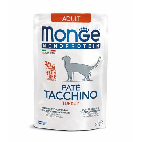 Monge Monoprotein je kompletné krmivo pre dospelé mačky bez obilnín a lepku. Jemná lahodná morčacia paštéta v hydinovom vývare pre dospelé mačky .