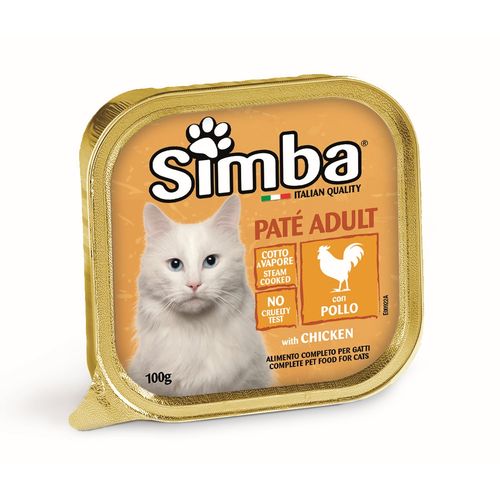 SIMBA CAT PATÉ WITH CHICKEN je kompletné krmivo pre dospelé mačky. Paštéta formulovaná s kvalitnými prísadami, ako je kuracie mäso, zdroj bielkovín a minerálov, varená v pare na zvýraznenie ich prirodzenej chuti a stimuláciu denného apetítu vášho domáceho maznáčika. Receptúra bola vyvinutá so špecifickou kombináciou vitamínov A-D3-E, aby spĺňala nutričné požiadavky na denné potreby vášho domáceho maznáčika. Bez pridaných farbív a konzervačných látok.