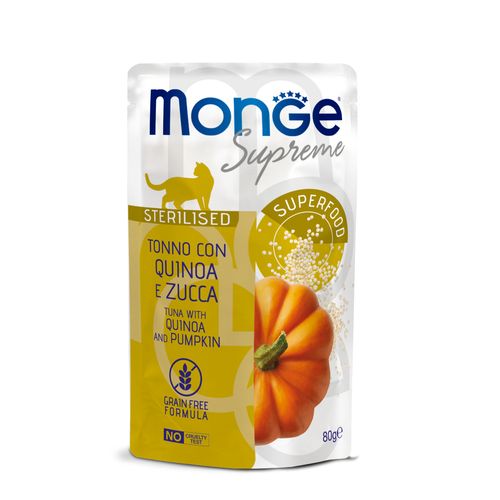 Monge Supreme Sterilised Cat Tuniak s quinoou a tekvicou je vyvážené krmivo pre sterilizované dospelé mačky. Je špeciálne formulované na udržanie ideálnej telesnej hmotnosti vašej sterilizovanej mačky, a to vďaka obsahu tekvice, superpotraviny a zdroja rastlinnej vlákniny, na spomalenie črevného tranzitu. Prvá zložka je oceánsky tuniak a receptúra je obohatená o Frukto-oligosacharidy (FOS), prebiotiká, ktoré podporujú zdravie čriev. Vybrané ingrediencie ako quinoa, energetizujúca superpotravina obzvlášť bohatá na antioxidanty a minerály, pomáhajú neutralizovať voľné radikály a podporujú každodennú vitalitu vašej mačky.