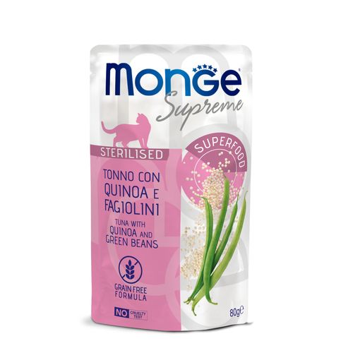 Monge Supreme Sterilised Cat Tuniak s quinoou a zelenými fazuľkami je vyvážené krmivo pre sterilizované dospelé mačky. Je špeciálne formulované na udržanie ideálnej telesnej hmotnosti sterilizovanej mačky vďaka obsahu zelených fazuliek, ktoré sú prirodzeným zdrojom rastlinnej vlákniny, na spomalenie črevného tranzitu. Prvá zložka je oceánsky tuniak a receptúra je obohatená o Frukto-oligosacharidy (FOS), prebiotiká, ktoré podporujú zdravie čriev. Vybrané ingrediencie ako quinoa, energetizujúca superpotravina obzvlášť bohatá na antioxidanty a minerály, pomáhajú neutralizovať voľné radikály a podporujú každodennú vitalitu vašej mačky.