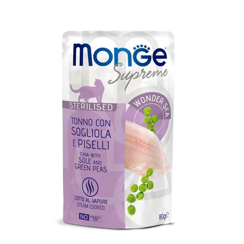 MONGE Supreme Sterilised 80g kapsička tuniakové kúsky so žltoplutvým platýsom a hráškom pre sterilizované mačky