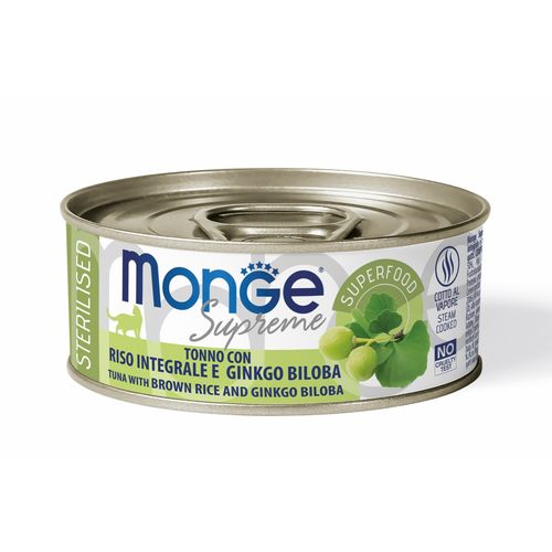 MONGE Supreme Sterilised 80g tuniakové kúsky s hnedou ryžou a ginkom bilobou pre sterilizované mačky