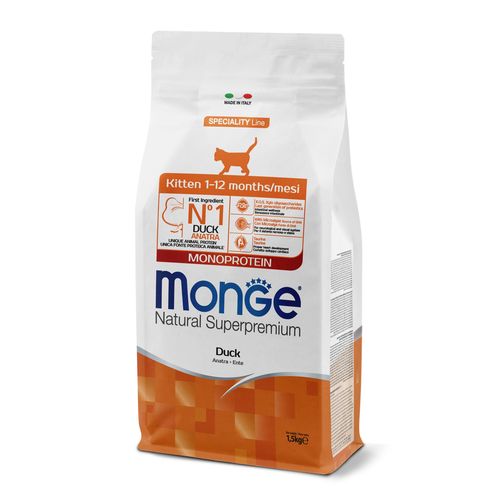 Monge Natural Superpremium Monoprotein Kitten Duck* je kompletné a vyvážené krmivo s kačacím mäsom pre mačiatka. Špeciálne vyvinuté pre pohodu vášho mačiatka vďaka oleju z mikro rias (Schizochytrium sp.), prírodnému zdroju DHA pre rozvoj neurologického a zrakového systému a taurínu pre správny vývoj srdca. Produkt formulovaný s jediným zdrojom živočíšnych bielkovín*, prvou zložkou je kačacie mäso a vyznačuje sa stráviteľnosťou a chutnosťou vďaka obsahu čerstvého mäsa. Receptúra je obohatená o XOS (xylo-oligosacharidy), prebiotiká novej generácie na podporu črevného zdravia. Zahrnutie vybraných zložiek, ako je šípka s antioxidačnými zlúčeninami na neutralizáciu voľných radikálov a yucca schidigera na obmedzenie črevných pachov, je výsledkom talianskeho výskumu na podporu kvality života nášho mačiatka. Bez pridaných farbív a umelých konzervačných látok. *Môže obsahovať stopy iných zdrojov bielkovín.