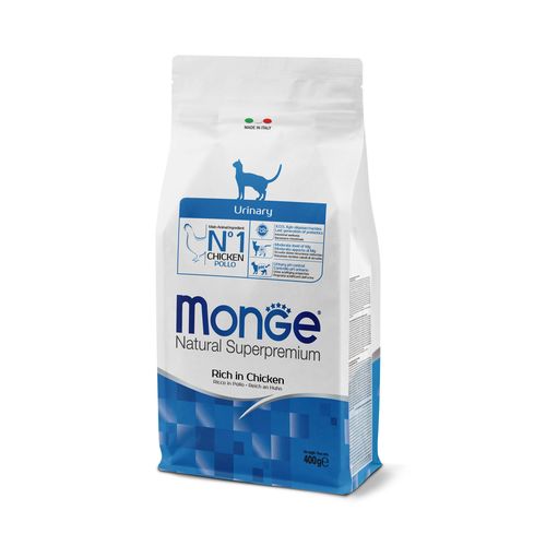 Monge Natural Superpremium Urinary Feline Rich in Chicken je kompletné dietetické krmivo určené na zníženie opakovanej tvorby struvitových kameňov u mačiek. Receptúra sa vyznačuje okysľujúcimi vlastnosťami moču a miernou úrovňou horčíka (Mg). Hlavnou živočíšnou zložkou je kuracie mäso a zloženie sa vyznačuje stráviteľnosťou a chutnosťou vďaka obsahu čerstvého mäsa. Receptúra je obohatená o XOS (xylo-oligosacharidy), prebiotiká novej generácie na podporu črevného zdravia. Zahrnutie vybraných zložiek, ako je yucca schidigera na obmedzenie črevných pachov, je výsledkom talianskeho výskumu na podporu kvality života našej mačky. Bez pridaných farbív a umelých konzervačných látok.