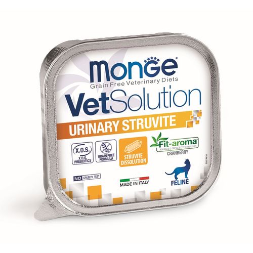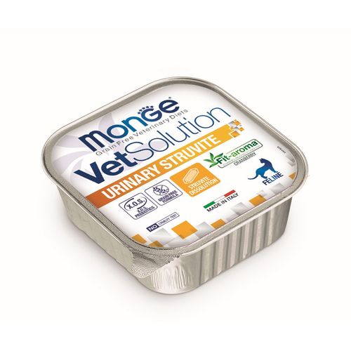 MONGE VETSOLUTION URINARY STRUVITE FELINE je kompletné veterinárne krmivo pre mačky, špeciálne vyvinuté na rozpúšťanie struvitových kameňov, znižovanie ich opakovanej tvorby a na podporu mačiek trpiacich syndrómom dolných močových ciest (FUS).
