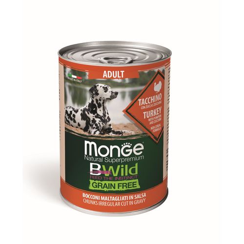 Monge Natural Superpremium BWild Grain Free Formula All Breeds Adult Dog Turkey with Pumpkin and Zucchini je kompletné a vyvážené krmivo pre dospelé psy. Špeciálne vyvinuté pre pohodu psov všetkých veľkostí vďaka výberu alternatívnych zdrojov sacharidov, ktoré nie sú derivované z obilnín, ako sú cuketa a tekvica. Receptúra je obohatená o xylo-oligosacharidy (XOS), prebiotiká novej generácie na podporu črevného zdravia. Zloženie podporuje kĺby vďaka obsahu glukozamínu a chondroitín sulfátu. Odporúča sa pre psov všetkých veľkostí.