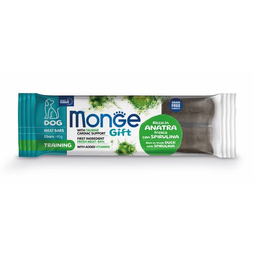Monge Gift Training Dog bohatý na čerstvú kačicu so Spirulinou je doplnkové krmivo pre dospelé psy. Bolo špecificky vyvinuté pre celkovú pohodu vášho psa vďaka obsahu taurínu na podporu srdcovej funkcie a s vitamínmi pre každodennú vitalitu. Produkt je formulovaný bez obilnín a s čerstvým mäsom, ktoré je cenným zdrojom vysoko stráviteľných bielkovín s vysokou biologickou hodnotou. Zahrnutie funkčných zložiek, ako je spirulina na obmedzenie stresu počas fyzickej aktivity, je výsledkom výskumu „Made in Italy“ na podporu kvality života našich psov. Bez pridaných umelých farbív a cukrov.