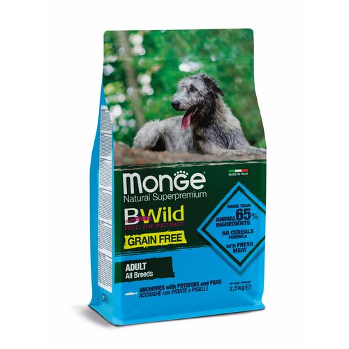 MONGE BWild Grain Free Adult 2,5kg bezobilninové kompletné krmivo pre dospelých psov všetkých plemien s ančovičkami, zemiakmi a hráškom