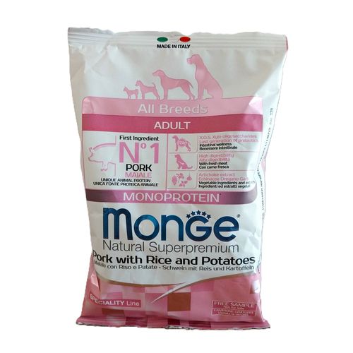 Monge Natural Superpremium All breeds Adult Monoprotein Bravčové mäso s ryžou a zemiakmi* je kompletné krmivo pre dospelé psy všetkých veľkostí. Špeciálne vyvinuté pre pohodu vášho psa. Produkt formulovaný s jediným zdrojom živočíšnych bielkovín*, prvou zložkou je bravčové mäso, a charakteristický svojou stráviteľnosťou a chutnosťou vďaka obsahu čerstvého mäsa. Receptúra je tiež obohatená o XOS (Xylo-oligosacharidy) novej generácie, ktoré sú prebiotikami na podporu črevnej pohody, a o rastlinné zložky a extrakty, ako je koreň echinacey, oregano, cesnak, extrakt z artičoky a spirulina, obsahujúce antioxidanty na neutralizáciu voľných radikálov. Bez pridaných farbív a umelých konzervantov. *Môže obsahovať stopy iných zdrojov bielkovín.