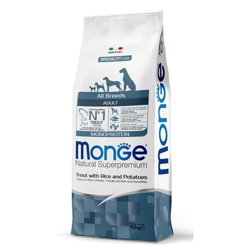 MONGE Natural Superpremium All Breeds Adult 12kg monoproteínové krmivo pstruh/ryža/zemiaky pre dospelé psy všetkých plemien