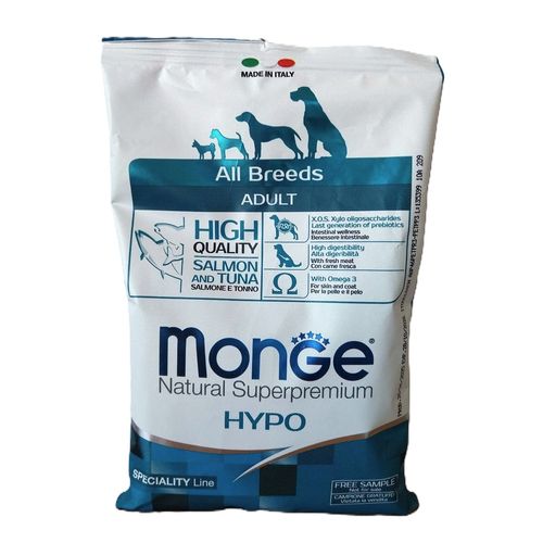 Monge Natural Superpremium Hypo with Salmon and Tuna je kompletné dietetické krmivo pre dospelé psy všetkých plemien, formulované na zníženie intolerancií na zložky a živiny s vybraným zdrojom sacharidov (ryža). Pohoda vášho psa je zaručená vďaka vysoko kvalitným živinám, ktoré sú výsledkom talianskeho výskumu. Bohaté na ryby a s Xylo-oligosacharidmi (XOS), najnovšou generáciou prebiotík pre črevné zdravie. Zloženie je charakterizované esenciálnymi mastnými kyselinami na podporu kože a srsti.