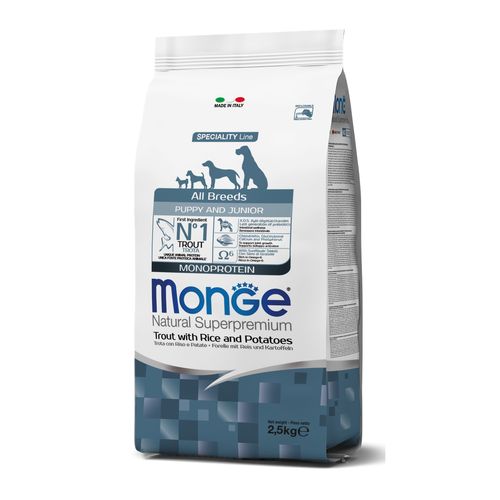 MONGE Natural Superpremium All Breeds Puppy 2,5kg monoproteínové krmivo pstruh/ryža/zemiaky pre šteňatá všetkých plemien