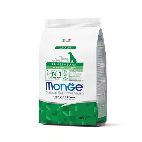 Monge Natural Superpremium Maxi Puppy and Junior Rich in Chicken je kompletné krmivo pre šteňatá maxi plemien (32-80 kg). Bolo špeciálne vyvinuté pre pohodu vášho psa, vďaka prítomnosti špičkových živín, ktoré sú výsledkom výskumu "Made in Italy". Prvou zložkou je kuracie mäso a receptúra je charakterizovaná svojou stráviteľnosťou a chutnosťou vďaka obsahu čerstvého mäsa. Receptúra je obohatená o XOS (xylo-oligosacharidy) novej generácie, ktoré sú prebiotiká na podporu črevného zdravia. Zloženie tiež obsahuje glukozamín a chondroitín sulfát na podporu vývoja kĺbov a vyvážený pomer vápnika a fosforu pre pravidelný rast kostí a kĺbov šteniatka. Bez pridaných farbív a umelých konzervačných látok.
