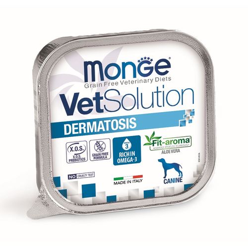 MONGE VETSOLUTION DERMATOSIS CANINE je kompletné diétne krmivo pre psov, špeciálne vyvinuté na podporu zdravej funkcie kože v prípade dermatózy a nadmerného vypadávania srsti. Toto krmivo obsahuje nukleotidy na podporu imunitného systému, Aloe vera pre zdravie pokožky a xylo-oligosacharidy (XOS) na udržanie rovnováhy črevnej mikroflóry. Receptúra sa vyznačuje vysokým obsahom kyseliny linolovej (LA) a súčtu kyseliny eikozapentaénovej (EPA) a dokozahexaénovej (DHA), ktoré sú kľúčové pre zdravú kožu a srsť.
