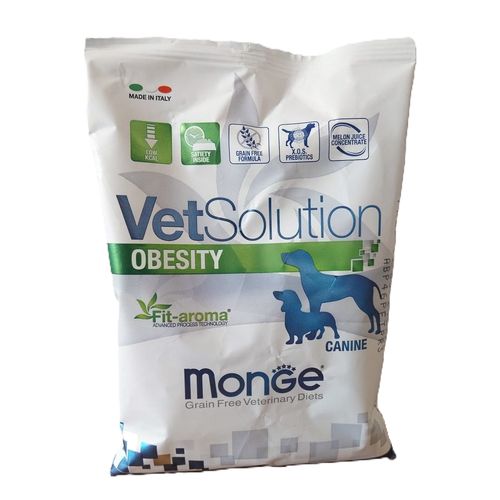 Monge VetSolution Obesity Canine je kompletné dietetické krmivo pre psov formulované na zníženie nadmernej telesnej hmotnosti. Obsahuje koncentrát melónovej šťavy na neutralizáciu voľných radikálov, semená skorocelu na oddialenie vyprázdňovania žalúdka a navodenie pocitu sýtosti a Xylo-oligosacharidy (XOS) na zabezpečenie črevnej mikroflóry. Je formulované s nízkou energetickou hustotou.